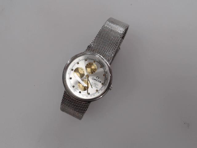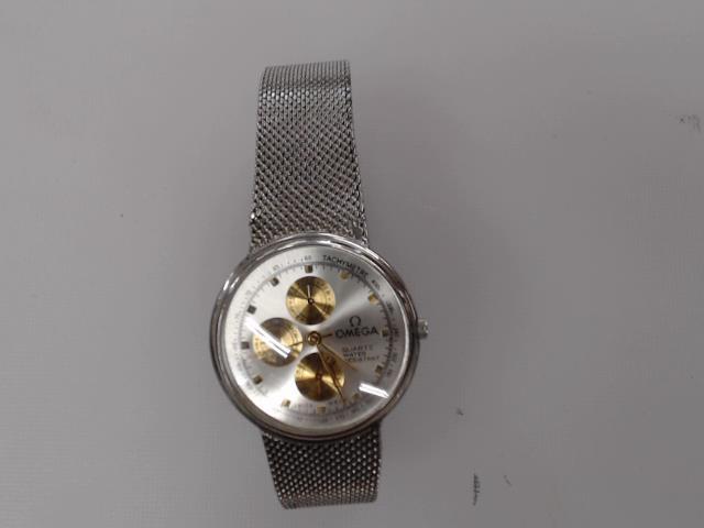 Stylish silver Omega watch with quartz movement.