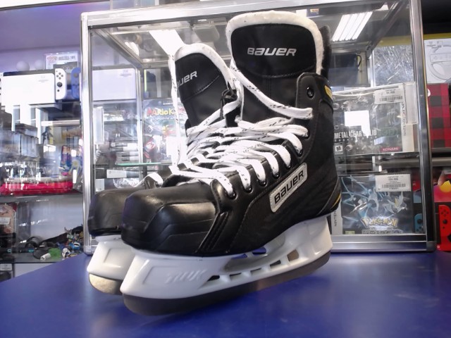 Bauer SUPREME PRO skates in excellent condition, featuring a sleek black and yellow design. Perfect for performance on the ice, these skates combine comfort, support, and style for any player.