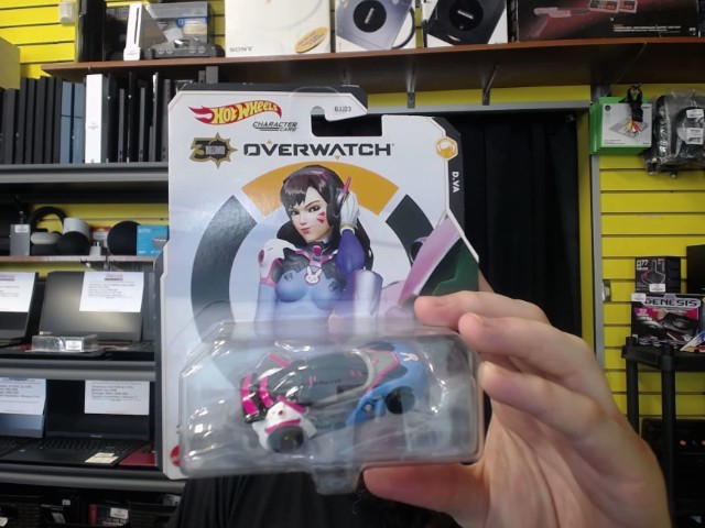 The Hot Wheels D.VA Overwatch car features a sleek design inspired by the popular gamer character, complete with vibrant colors and iconic details, perfect for collectors and fans alike.